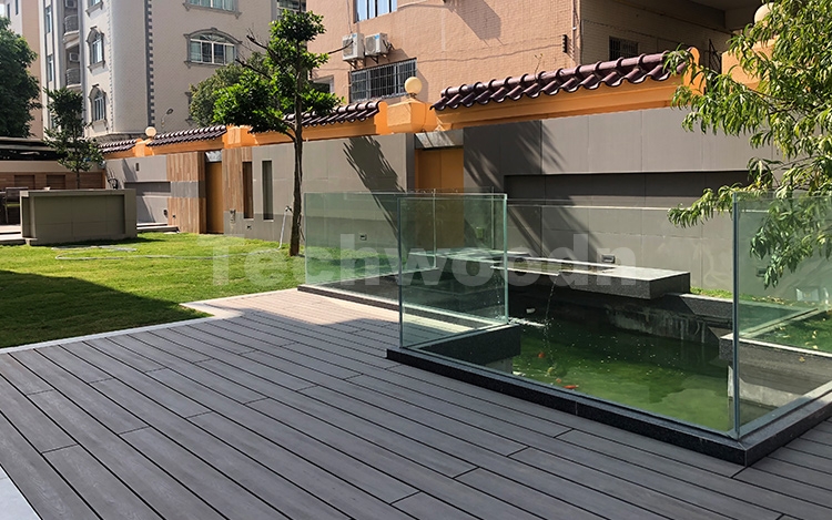 在混凝土露台上安装木塑地板需要先评估混凝土的状况,如果已经出现沉陷和开裂严重,需要先处理好才可能铺设地板。在铺设前仍需确保混凝土尽可能的平整和水平,高低不平整也会导致地板平台不稳定。我们提供隐藏式紧固系统和地板底部的龙骨结构平台,安装后没有裸露的钉子和螺丝。