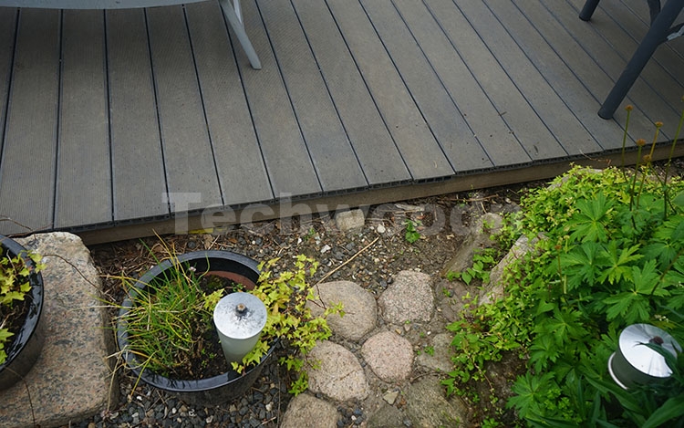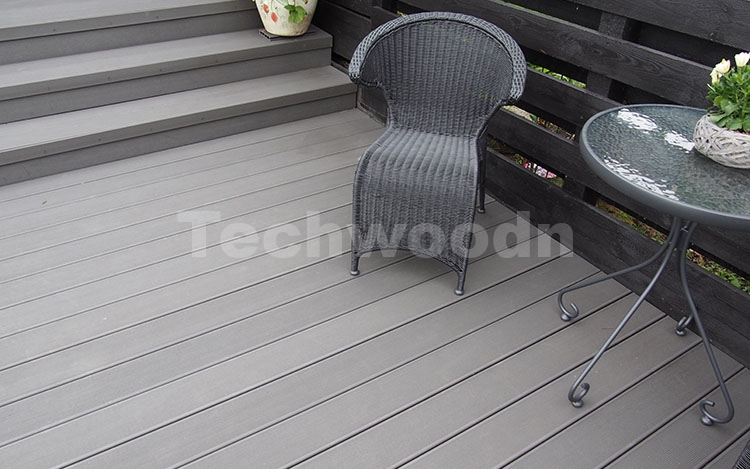 灰色木塑地板拥有天然木材般的木纹效果和触感,并且还有很多优点,不仅耐用,安全,美观,而且是由90%的回收材料制成,比实木地板更环保。木塑地板不需要特别的保养和维护,在长期使用后不容易变色和老化。