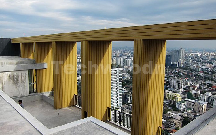 以上图片为我们在泰国商业住宅建筑上的木塑墙面装饰板工程项目。该项目采用了黄色的木塑墙板,铺设在顶楼外墙,为整栋建筑注入现代的风格。