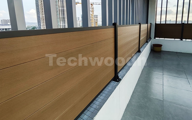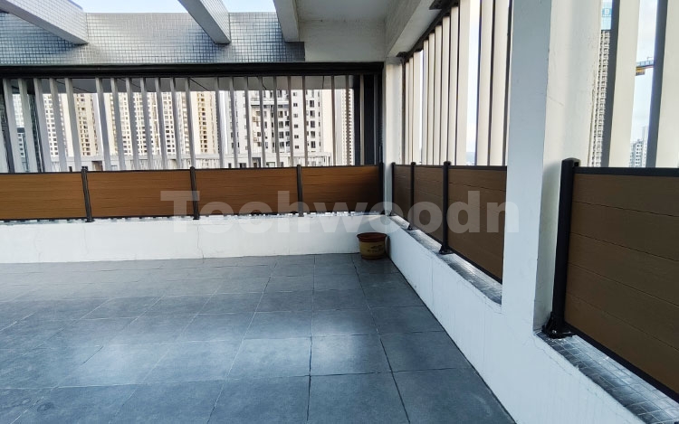 以上项目图片是一个位于顶楼露台的项目,采用了棕色的塑木围栏作为围栏材料,与现代设计相协调。围栏安装在现有的混凝土上,我们定制的尺寸增加了整个围栏的高度,提供了足够的私密性和安全性,让住户可以在顶楼享受阳光和空气。